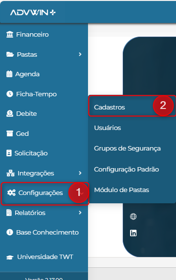 II. No menu principal, clique em ‘Configurações’ (01), depois em ‘Cadastros (02).