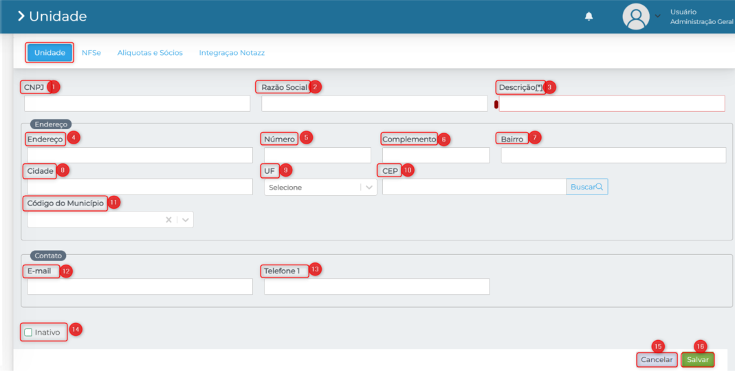 15. Cancelar: Clique aqui para cancelar o cadastro da unidade.