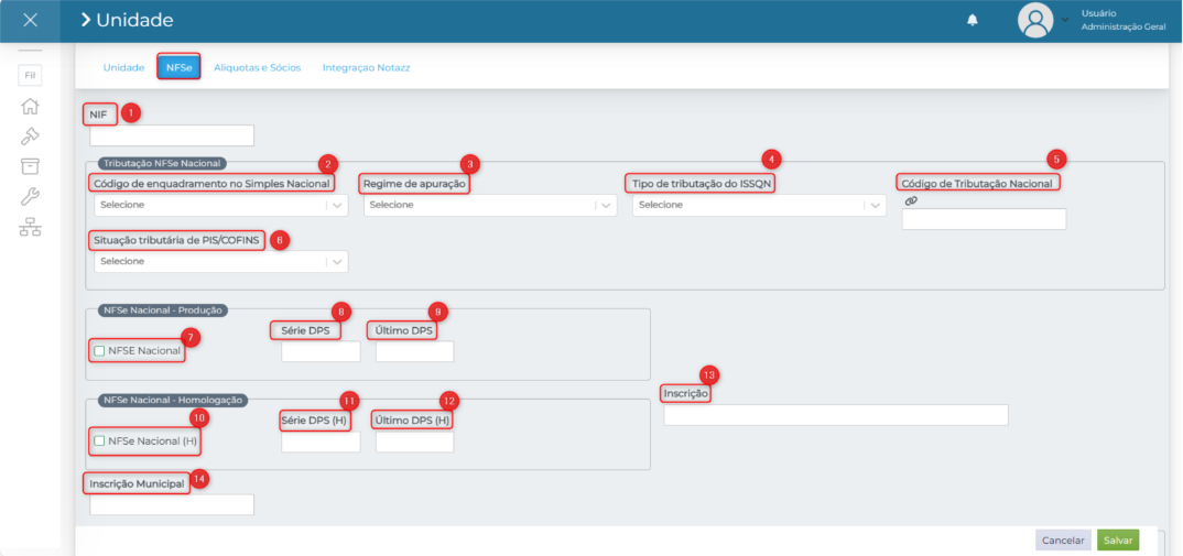 7. NFSE Nacional: Marca se a unidade está habilitada para emitir NFS-e Nacional (nota real, em produção).