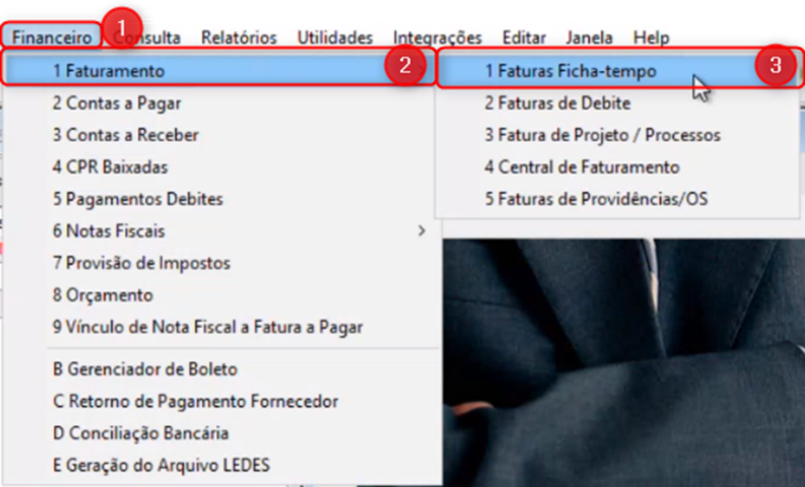 II. No menu, clique em ‘Financeiro’ (01), ‘Faturamento’ (02) e ‘Faturas Ficha-Tempo’ (03).