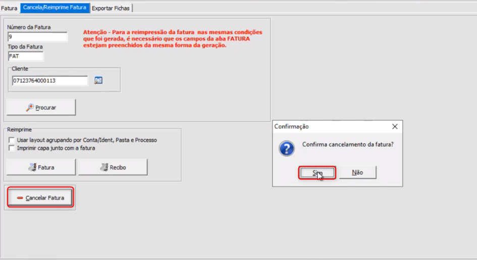 IV. Clique em ‘Cancelar Fatura’ e confirme o cancelamento da fatura. Dessa forma, a fatura será apagada e as Fichas-Tempo lançados permanecerão as mesmas, sem necessidade de fazer um novo lançamento.