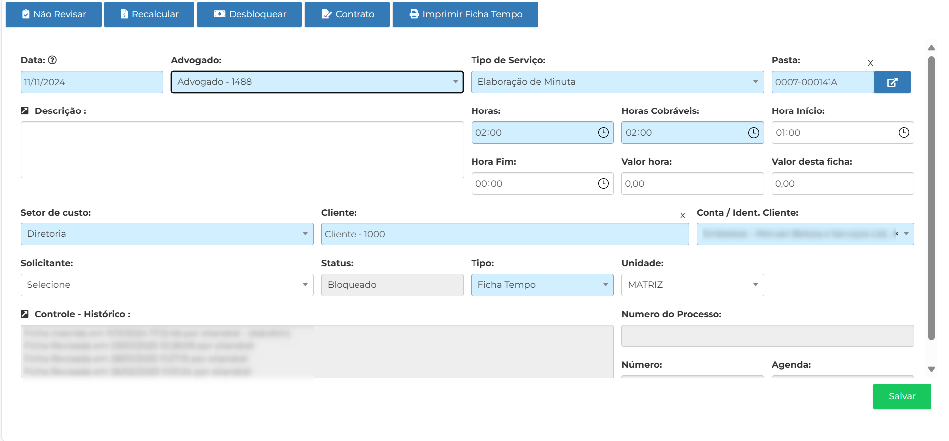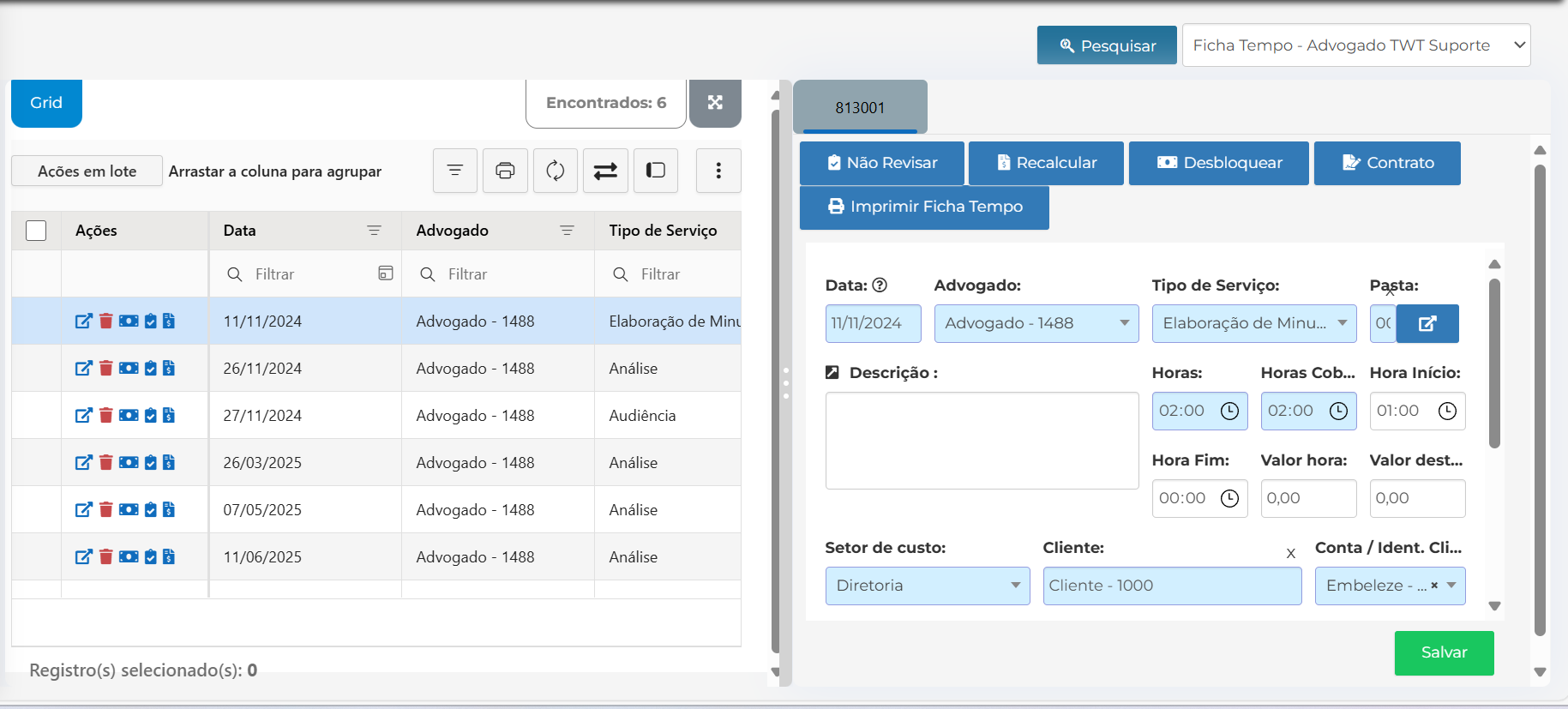 Na tela de Ficha - Tempo, é possível realizar algumas ações: