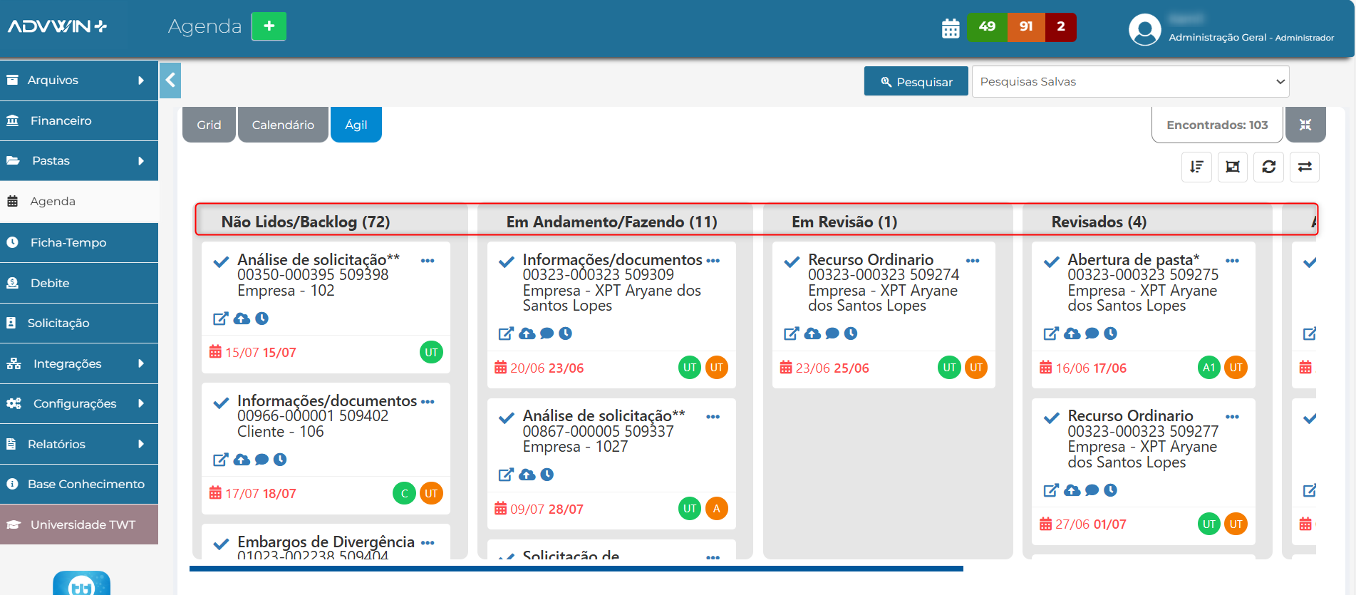 - No layout da tela Ágil os agendamentos de prazos tornam-se cards com uma visualização simples e rápida, ficam distribuídos nas colunas conforme o andamento do workflow.