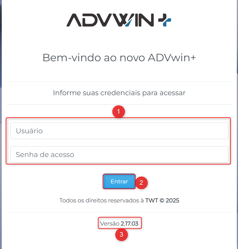 Para ingressar no sistema do ADVWIN+ é necessário que você insira os dados: usuário e senha de acesso no campo um (1) e clique no botão Login (2), conforme mostrado na figura acima.