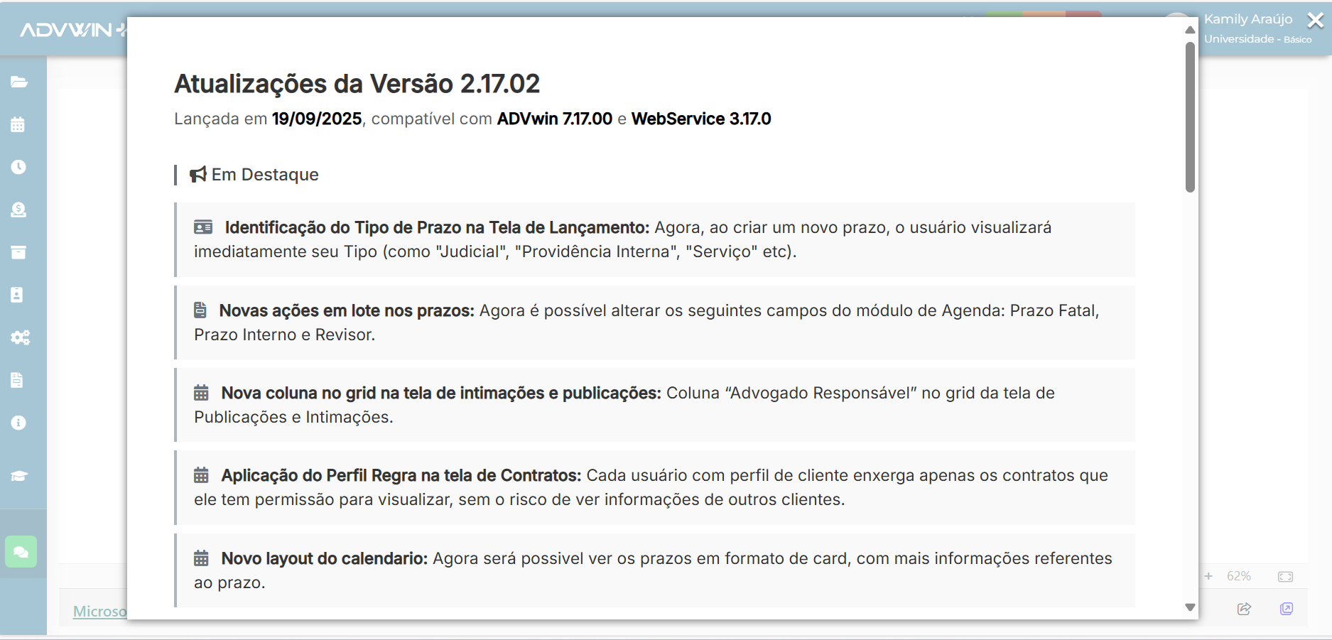 No primeiro acesso, e a cada atualização, é apresentada tela com as novidades do ADVWIN+, relativas àquela versão: