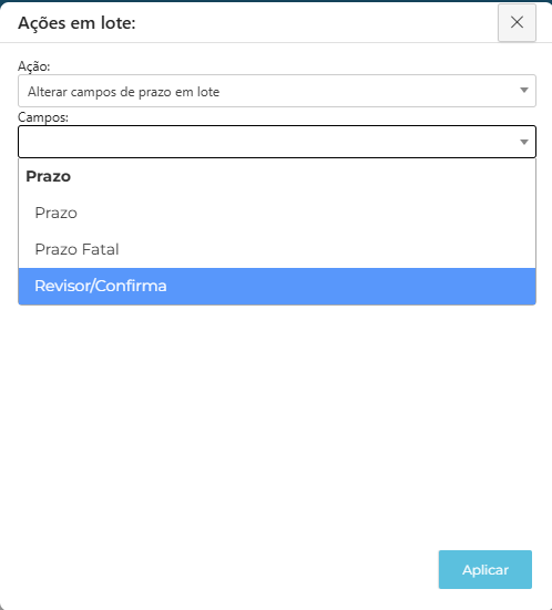 ATENÇÃO: OS CAMPOS DISPONIVEIS PARA SEREM ALTERADOS EM LOTE SÃO: PRAZO, PRAZO FATAL E REVISOR/CONFIRMAR .