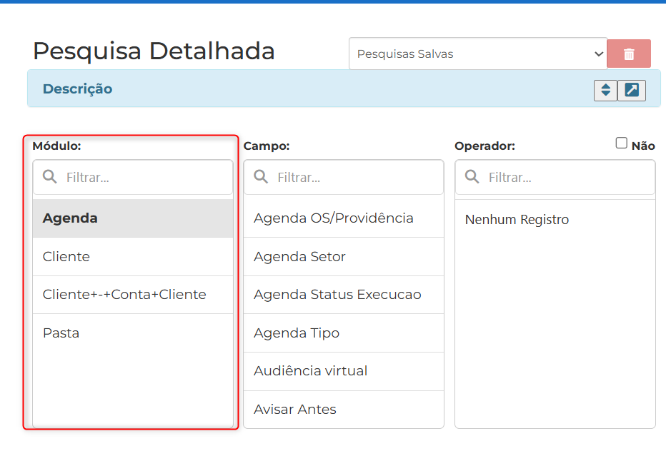Observação: Ao selecionar qualquer um dos módulos com exceção ao módulo de “Agenda” será exibido a opção “Não exista” que fará uma pesquisa por registros que não contenha a informação preenchida no parâmetro de pesquisa.