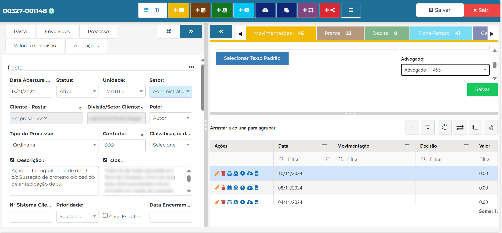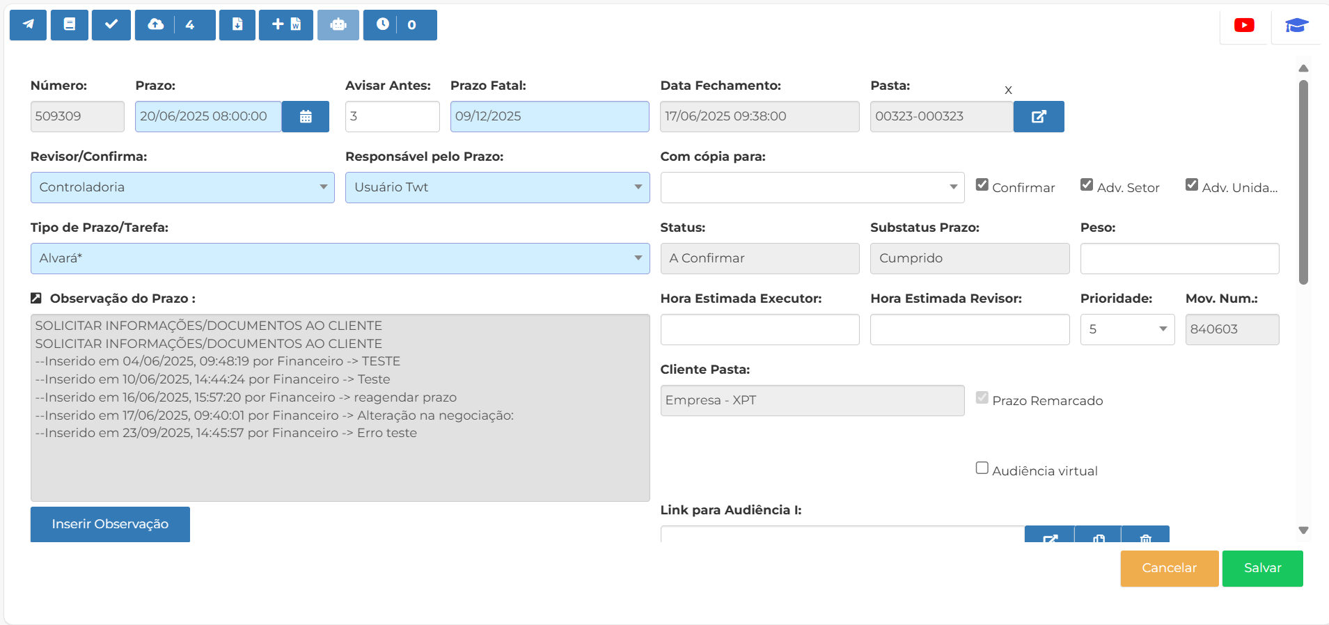 Ao abrir a pasta desejada, é possível acessar o prazo dentro da própria pasta ou dentro de uma movimentação da pasta selecionada.