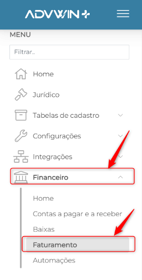 Para acessar o módulo de faturamento, no menu das tabelas de cadastro, siga o caminho: FINANCEIRO > FATURAMENTO.