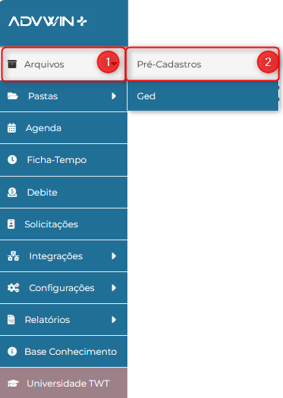 II. No menu principal, clique em ‘Arquivos’ (01), depois em ‘Pré-cadastro (02).