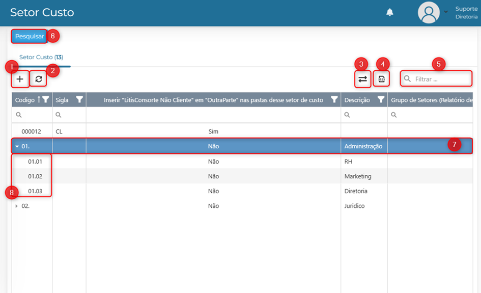 Os Setores de Custo são a divisão interna do Escritório ou Departamento Jurídico. Trata de uma tabela de pré-cadastro compartilhada entre financeiro e jurídico. Essa divisão é importante para obter dados de faturamento, rentabilidade por área e projeções por área do jurídico.