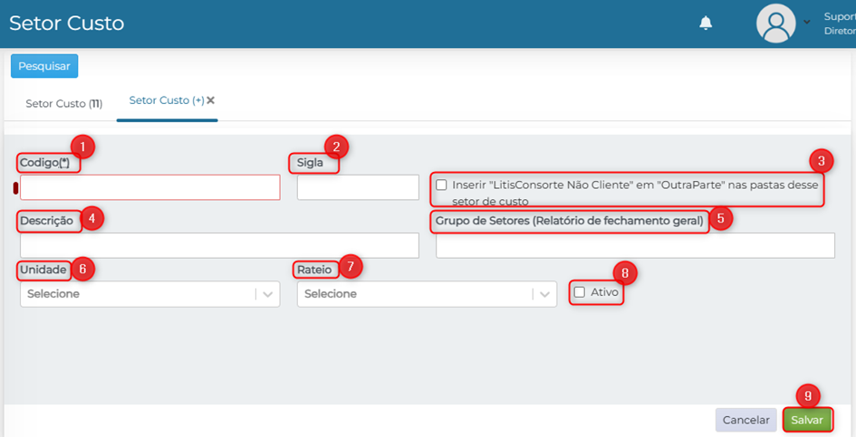 9. Salvar: Para salvar o cadastro do setor de custo, clique em salvar.
