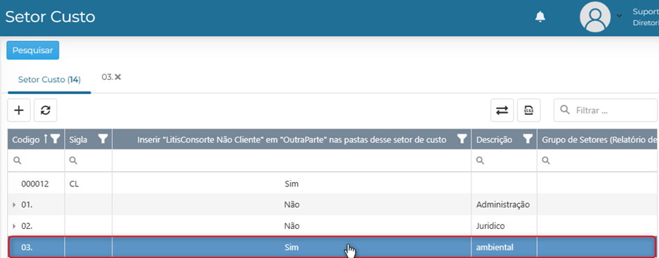 3. Flag: Se esse item estiver selecionado: em uma pasta, ao selecionar esse setor, na tabela de seleção de “outra parte” aparecerá as opções de “LitsConsorte não Cliente”.
