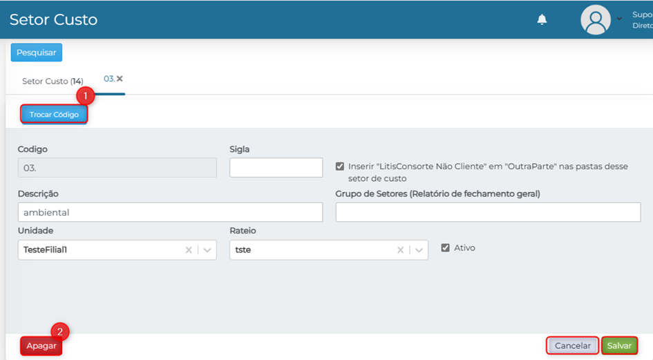 Após salvar o setor de custo, é possível editar suas informações, e trocar o código.