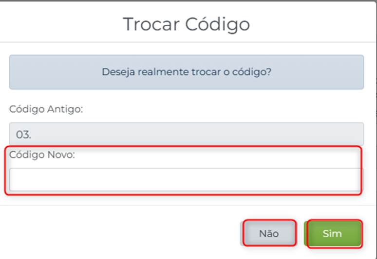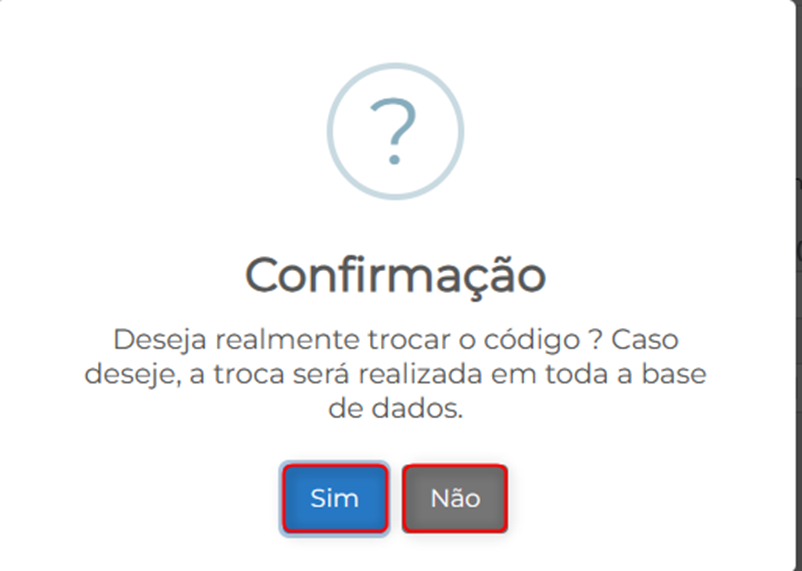 IV. O sistema emitirá um aviso de confirmação da troca do código, clique em ‘Sim’ para confirmar ou ‘Não’ para cancelar a troca.