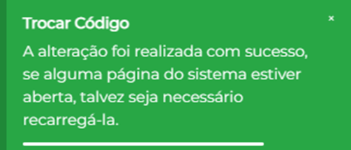 V. Após trocar o código, uma confirmação será apresentada na tela: