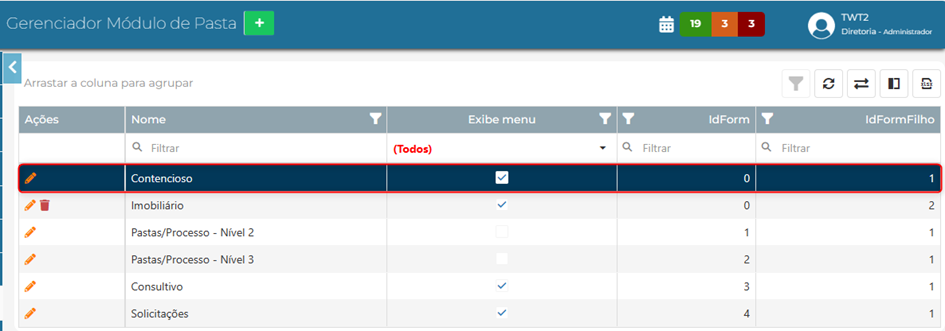 III. Selecione na tabela de ‘Gerenciador Módulo Pasta’, o nível da pasta que deseja vincular os setores de custo: