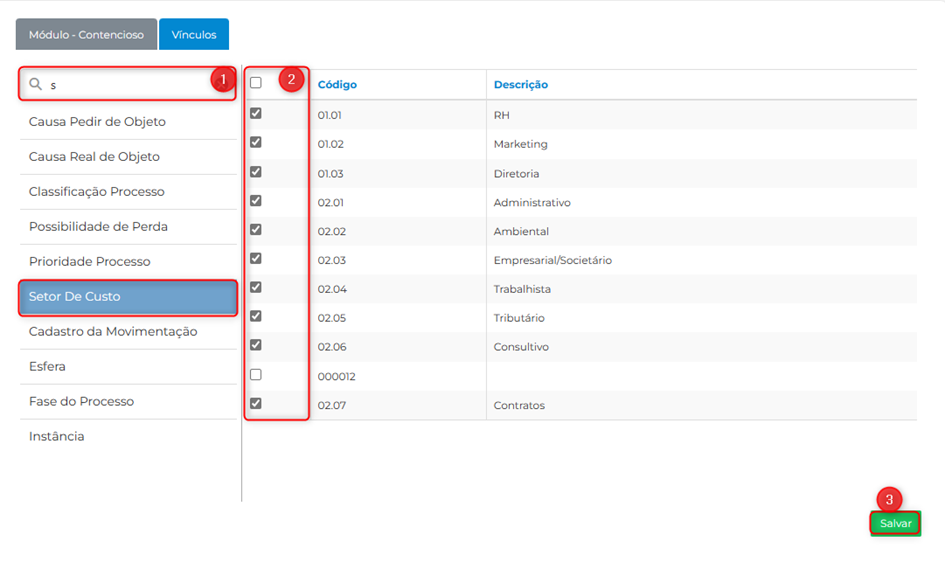 V. Pesquise por ‘Setor De Custo’ (01), para vincular os setores de custo ao nível que está sendo configurado, selecione no campo (02) os setores que deseja alocar, por fim, clique em ‘Salvar’ (03).
