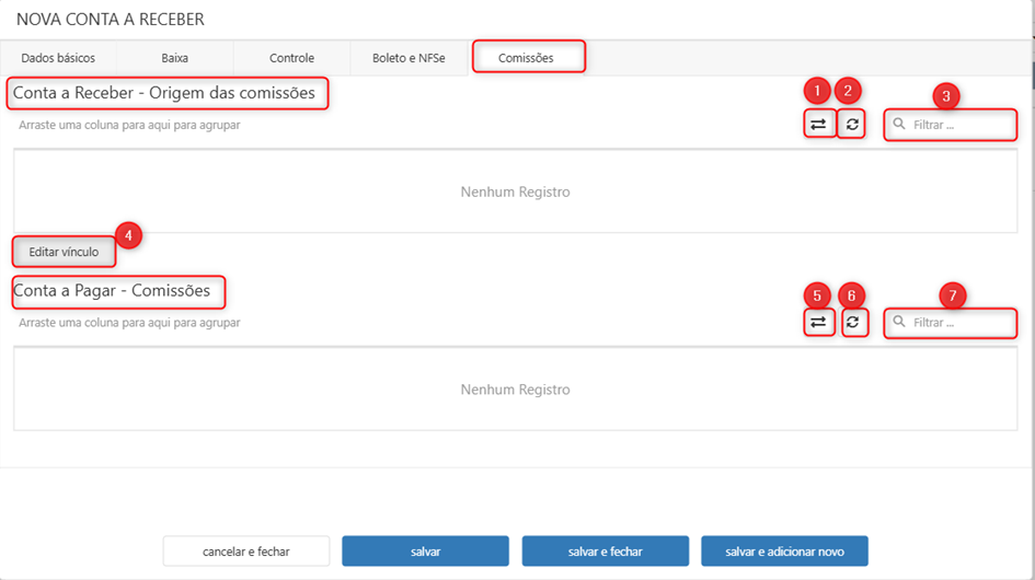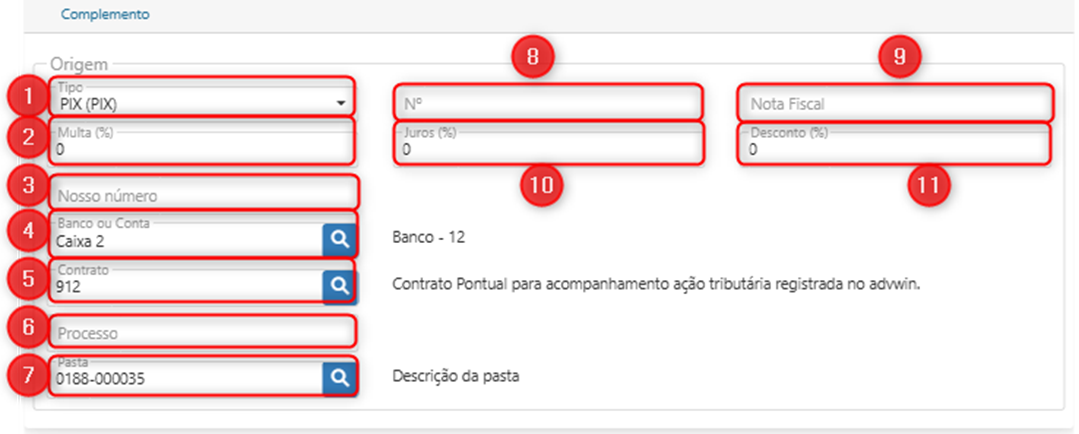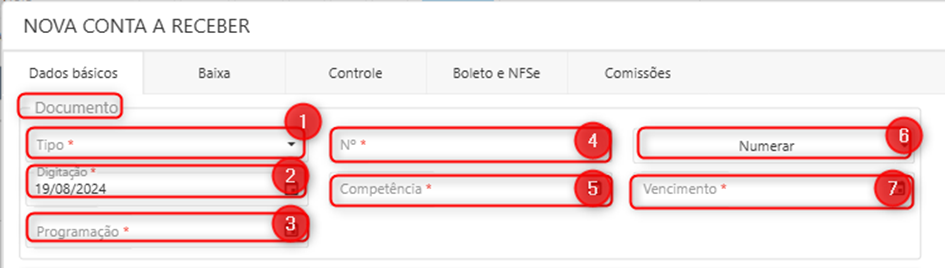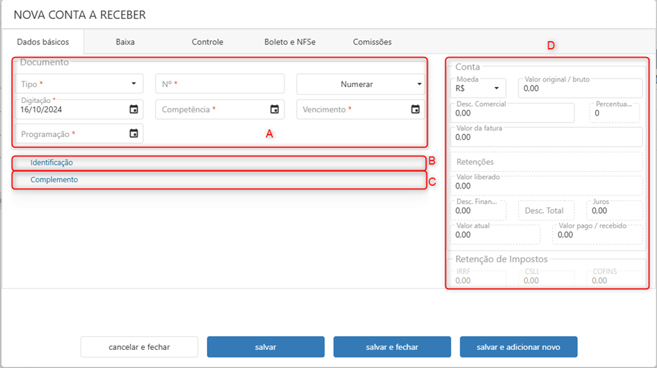 A tela que que o sistema abre para inserção de uma conta a receber pode ser dividida em: