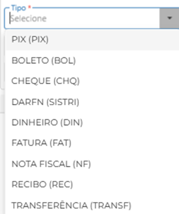 1. Tipo: selecione o tipo de CPR, podendo ser pix, boleto bancário, transferência, entre outros.