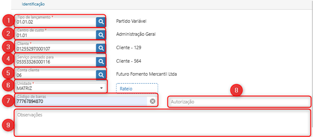 6. Unidade: selecione a unidade para rateio.