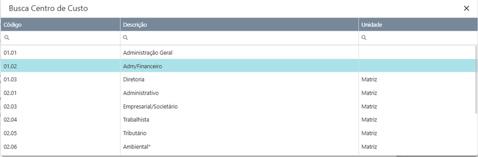 5. Unidade de custeio: A unidade de custeio irá aparecer de acordo com o tipo de unidade selecionado no item 4.