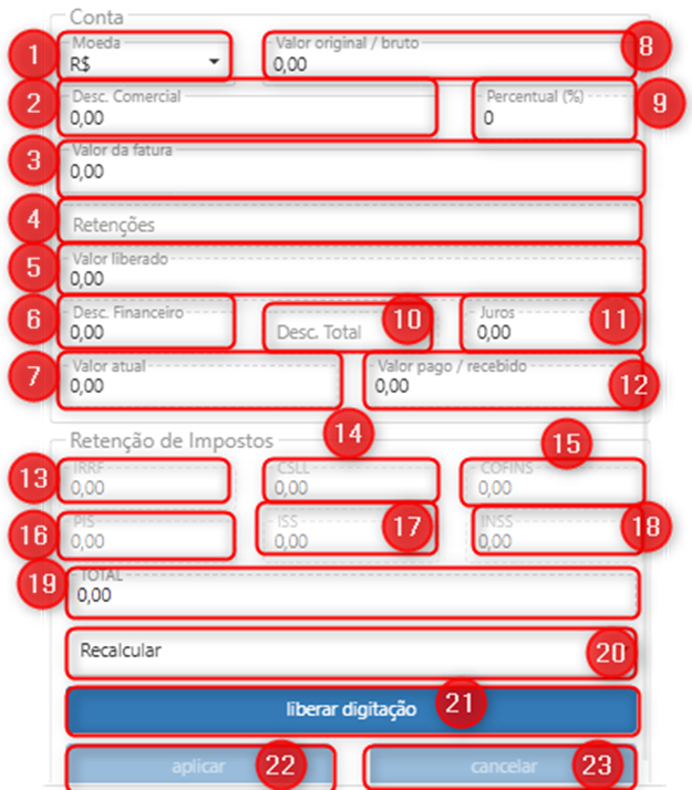 23. Cancelar: cancela o preenchimento do campo de impostos.