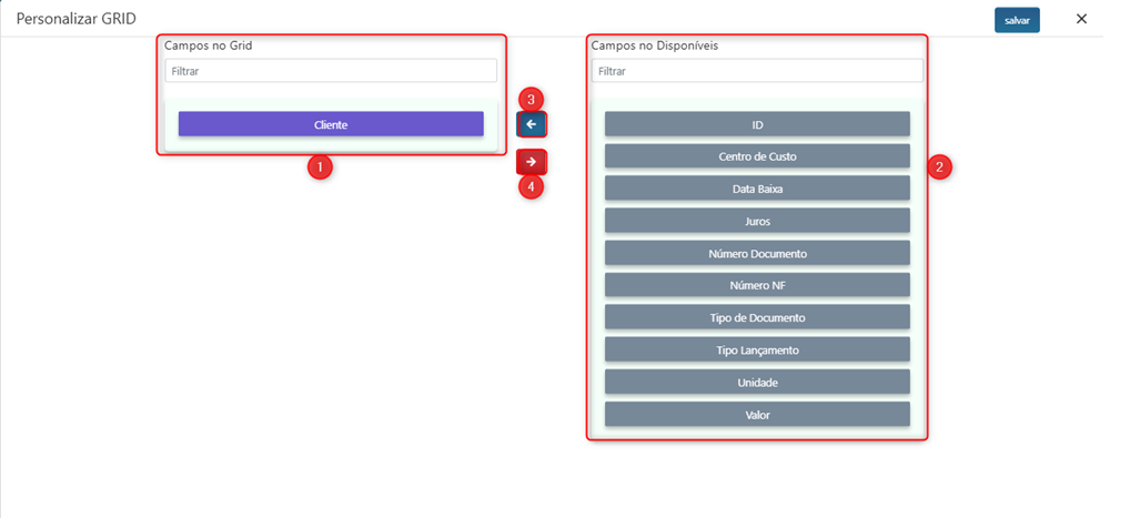 III. Use as setas (03) e (04) para realocar os campos disponíveis para campos exibidos no Grid e vice-versa.