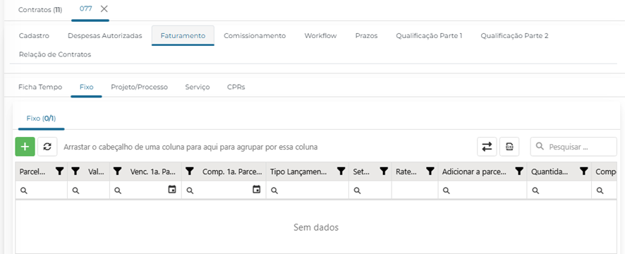 No cadastro do contrato, dirija-se à opção "Faturamento" e, em seguida, a "Fixo", para cadastrar uma fatura fixa.