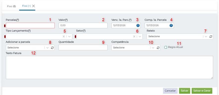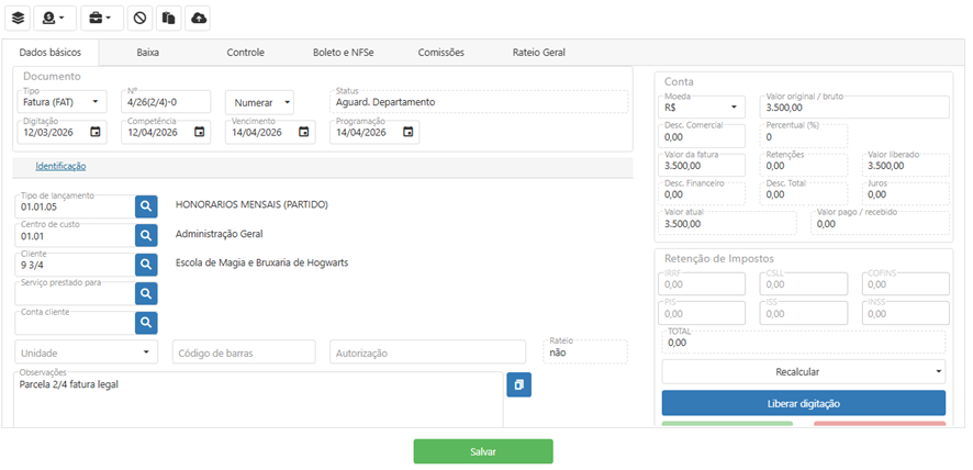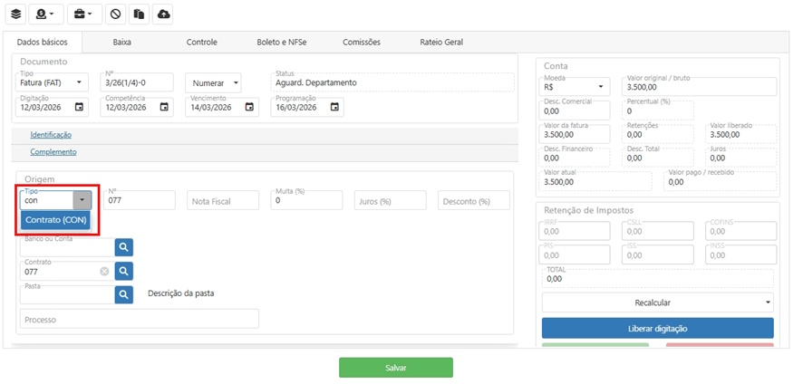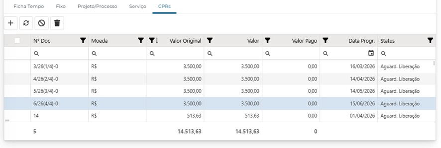 Após salvar e gerar a fatura, ela estará cadastrada, e as CPRs desejadas serão criadas automaticamente.