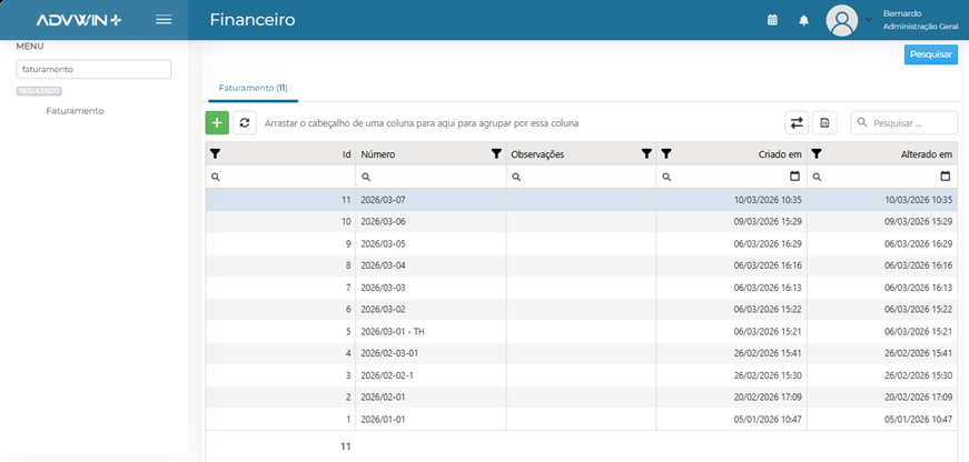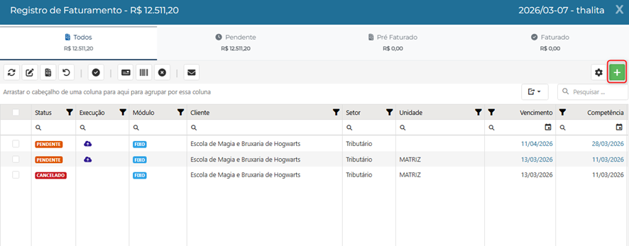 Dentro da opção "Registro de Faturamento", clique no símbolo de “+” para criar um novo registro (RF).