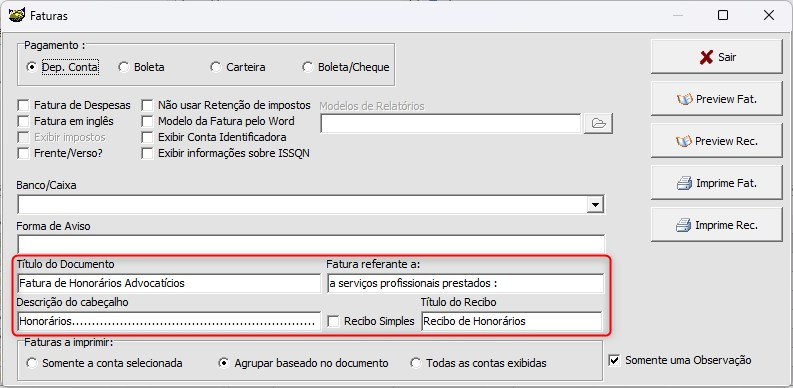 3. O corpo e o título das faturas são alterados nos campos abaixo: